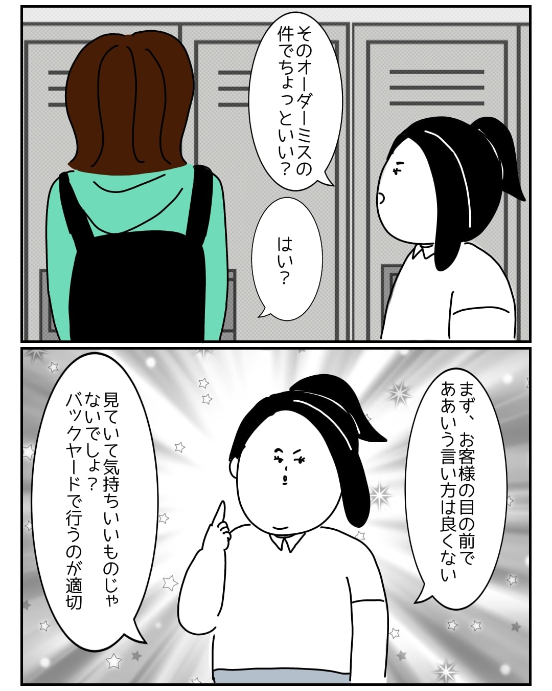 実際学生バイトの時代私がミスしておこられた時、リーダーがつい売り場で注意したもんだからそれを見たお客さんがサービスカウンターにクレームいれて大変だったことある